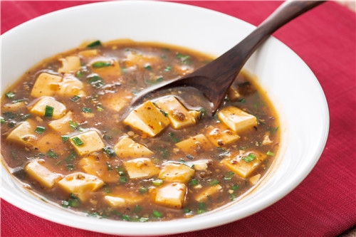 三、将豆腐放入另一清汤或开水锅里煮沸,一见豆腐粒浮起,立即捞出,放入鸡汤碗里即好。