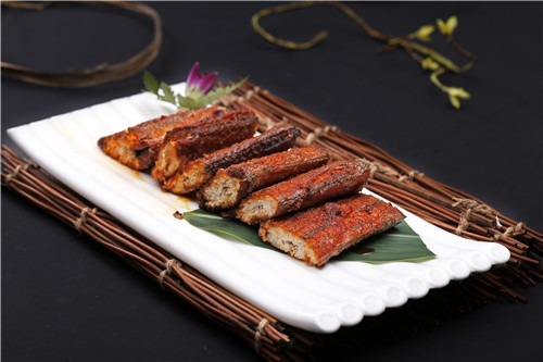 5.待锅内油温又升高至沸热时,再将鱼段回锅冲炸一下,待外皮炸至香脆时捞出,控净余油,装在盘内即成,食时蘸花椒盐。