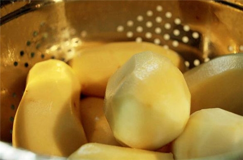 2、把煮熟的土豆取出,剥去外皮,切成小块。