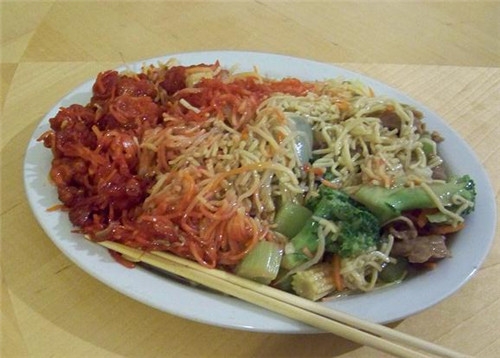 (3)将广式炒面放入平底锅中,煎至两面酥脆后即可盛入盘中,再把作法(2)的芡汁淋上即可。