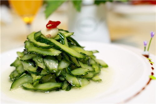 4,将以上材料拌匀,调味,红椒切丝,置于热油中爆香,浇于拌好的凉菜上。