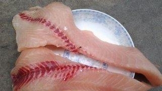 1.将鱼中段洗干净后,由腹部切开,片成2大片,每一大片再斜刀切6下,成为7片(共14片)。