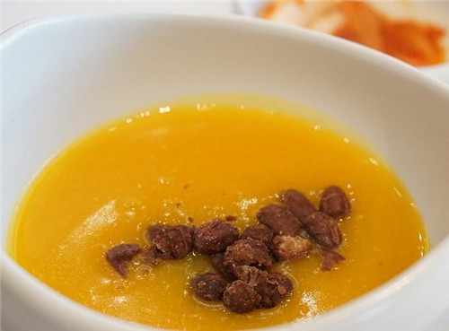 5、米粥熬煮至米粒开花时,加入山药和南瓜丁继续熬煮5分钟;