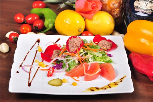6.把煎好的牛肉切成小丁,放入大玻璃碗中,再倒入刚才煮好的土豆,切好的洋葱丁,加盐,黑胡椒碎,橄榄油拌匀,最后装饰生菜叶,装盘就好了。生菜可以只做装饰,也可以多准备些,用生菜叶包着牛肉沙拉吃~